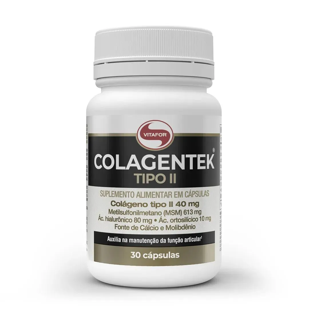 COLAGENTEK ® TIPO II Vitafor, é um suplemento de alta tecnologia, composto por colágeno tipo II, metilsulfonilmetano (MSM), ácido hialurônico, extrato de alho em pó (Allium sativum L.) e minerais, com zero adição de açúcares. Por uma vida mais flexível Estima-se que 20% da população sofra com algum problema nas articulações. Seja pelo sobrepeso, pela prática de uma atividade física ou o processo de envelhecimento, nossas articulações são exigidas durante toda a vida e tendem a se comprometer com o passar dos anos. As articulações garantem a movimentação do esqueleto. Articulações saudáveis possibilitam caminhar, abaixar-se, levantar-se. Quando as articulações estão desgastadas sentimos dores e perdemos a amplitude de nossos movimentos. Não é possível impedir a natureza do corpo humano e suas particularidades, mas podemos envelhecer de forma mais saudável através da atividade física, nutrição eficiente e suplementação necessária para complementar a falta de nutrientes. Nossas articulações são formadas por 60% de colágeno. A ausência dessa proteína agrava os problemas nas articulações, que são exigidas centenas de vezes durante o dia. Estudos demonstram que a suplementação com o colágeno tipo 2, pode agir auxiliando na manutenção da função articular1 e consequentemente podendo ser um aliado no alívio de dores articulares.