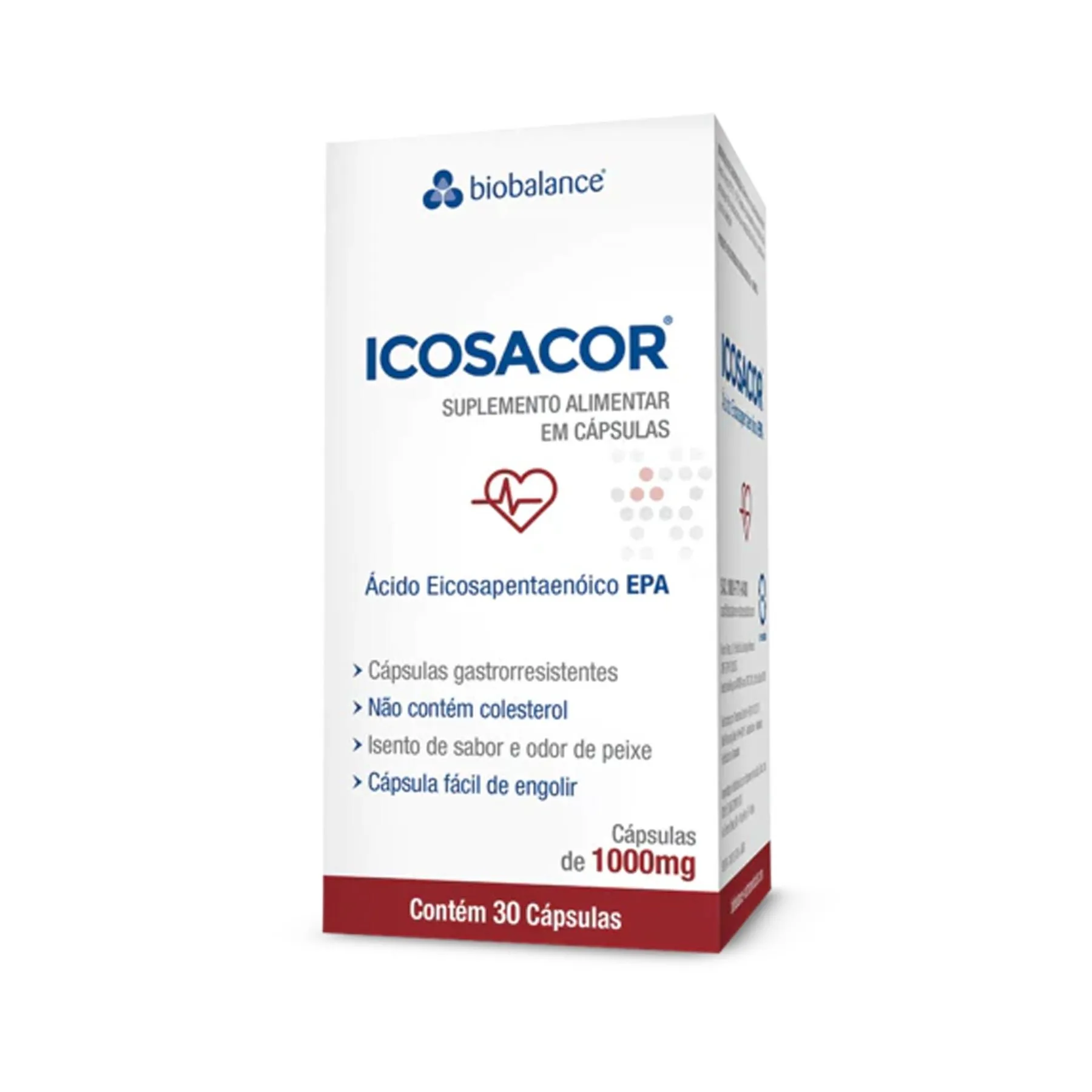 Ômega 3 - Icosacor EPA 1g - BIOBALANCE O Ômega-3 EPA é importante para diversas funções do organismo, entre elas, auxiliar na redução de triglicerídeos. Alto teor de EPA (ácido eicosapentaenóico), em cápsulas gastrorresistentes. Importante para diversas funções do organismo, entre elas, auxiliar na redução de triglicerídeos. Suplemento purificado, livre de colesterol e gorduras saturadas. Matéria-prima sustentável e de alta qualidade A Biobalance utiliza a natureza como base para a fabricação de produtos de alta qualidade, por meio do uso de ingredientes puros e livres de contaminação. Icosacor® possui ômega-3 EPA extraído de peixes oriundos das águas frias e intocadas do Pacífico Sul, ao longo da costa do Chile e Peru. Estas zonas de pesca da América do Sul são as mais regulamentadas do mundo. A cada ano as quotas de pesca são ajustadas para mais ou para menos, ou mesmo postergadas em função da saúde, tamanho e número de peixes disponíveis. O uso de peixes desta região garante, portanto, não apenas produtos de elevada pureza e qualidade, mas também assegura a sustentabilidade ambiental do processo, garantindo o uso responsável dos recursos do oceano. Máxima Purificação Icosacor® passa por um processo de purificação, no qual se obtém EPA purificado e isento de contaminações com metais pesados (cádmio, chumbo, mercúrio), dioxinas e PCBs. As cápsulas gastrorresistentes de Icosacor® proporcionam maior conforto, pois evitam retrogosto e garantem a liberação do conteúdo diretamente no intestino.