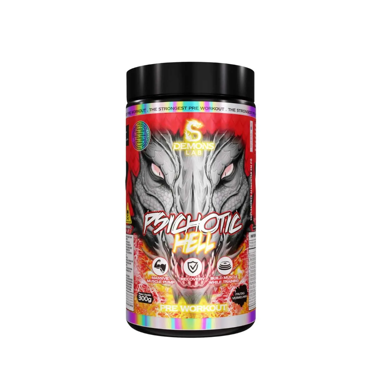 Pré-Treino - Psichotic Hell - Demons Lab Psichotic Hell é uma fórmula pré-treino insana e totalmente carregada que fornece energia, foco e pump incomparáveis para você desejar seu próximo treino! Psichotic Hell combina efetivamente ingredientes beta-alanina, L-arginina, cafeína, L-carnitina, ácido clorogênico, tirosina, taurina, minerais e vitaminas fornecendo poder explosivo, força, concentração, Foco e aumentar a resistência.